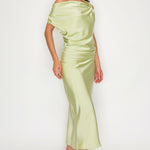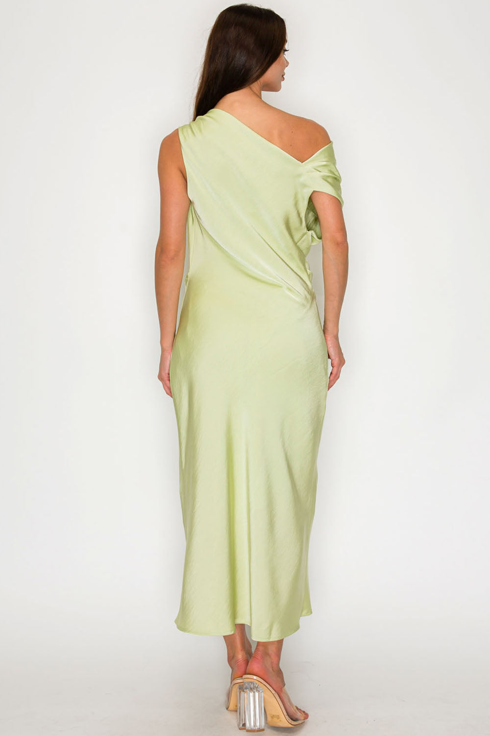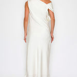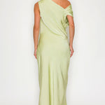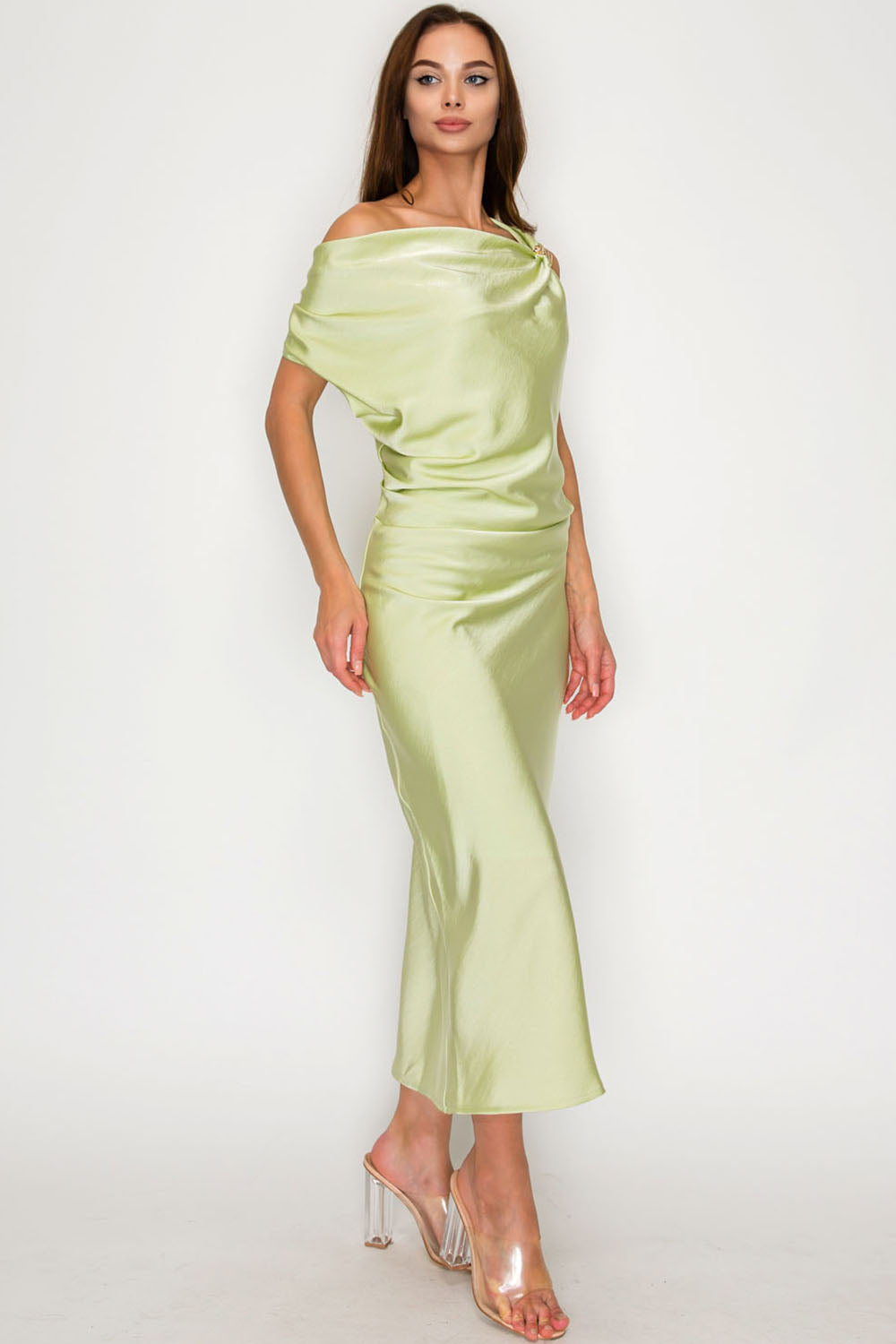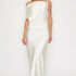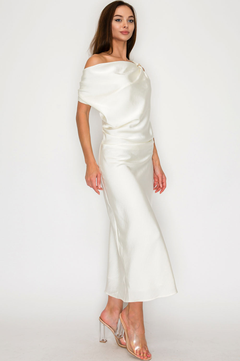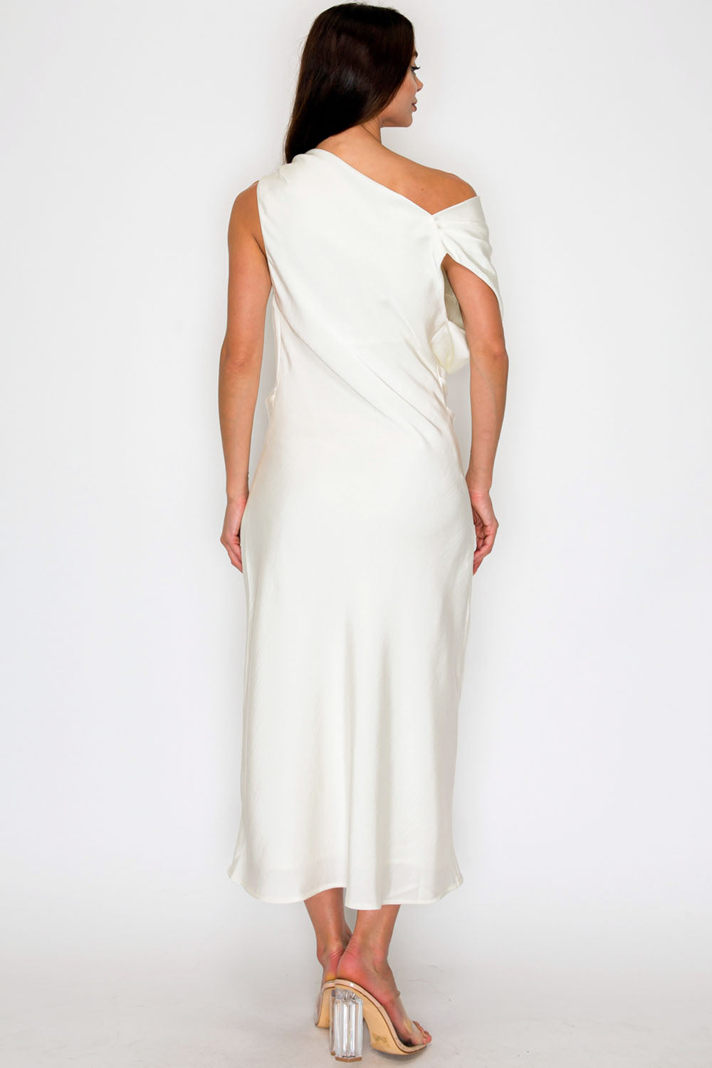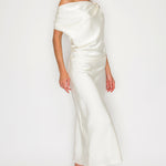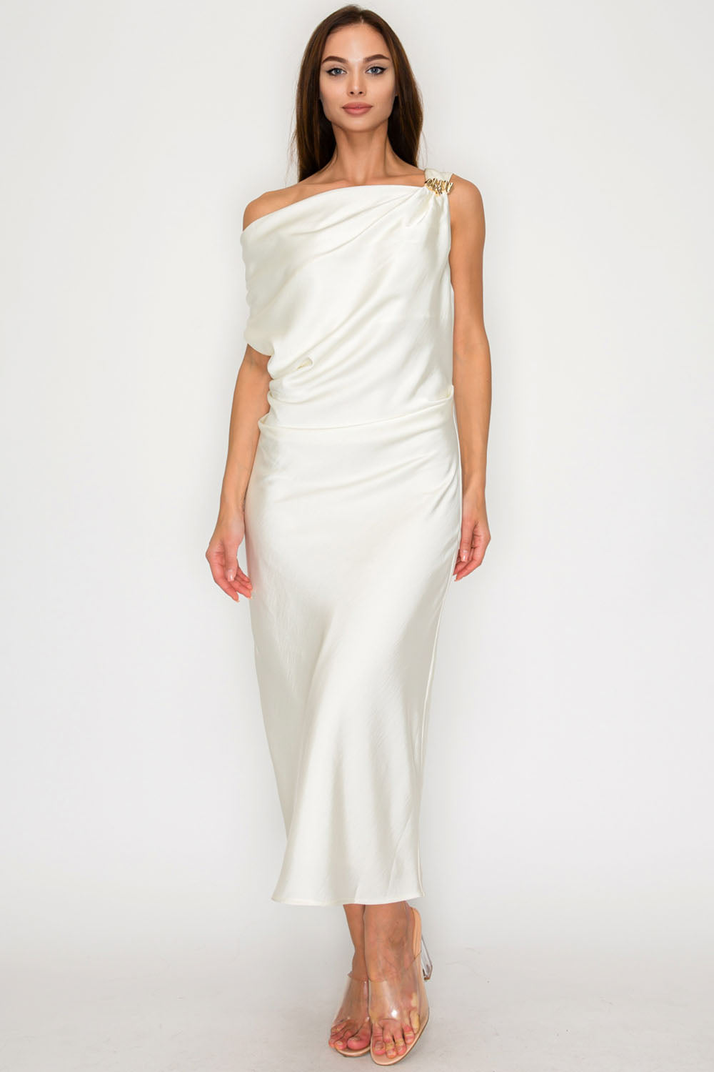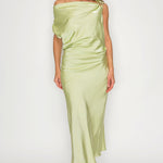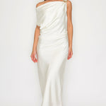 One-Shoulder Satin Drape Midi Dress with Brooch Detail