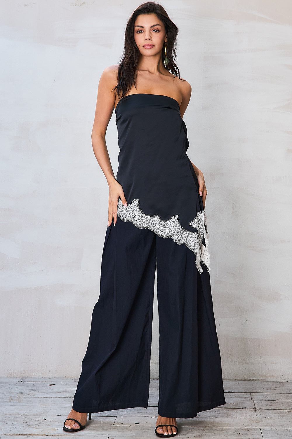 Strapless Printed Top with Lace & Wide-Leg Pants