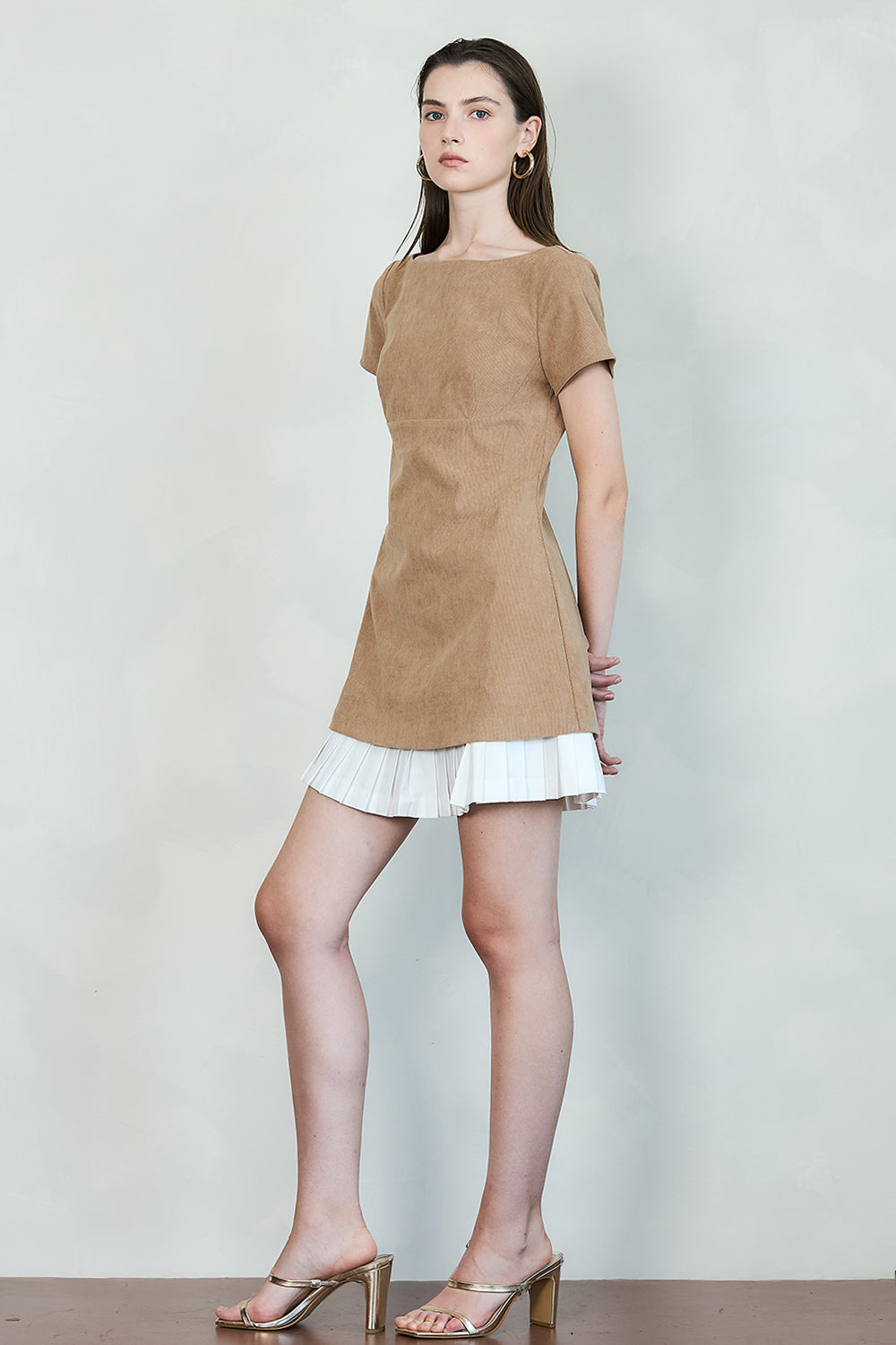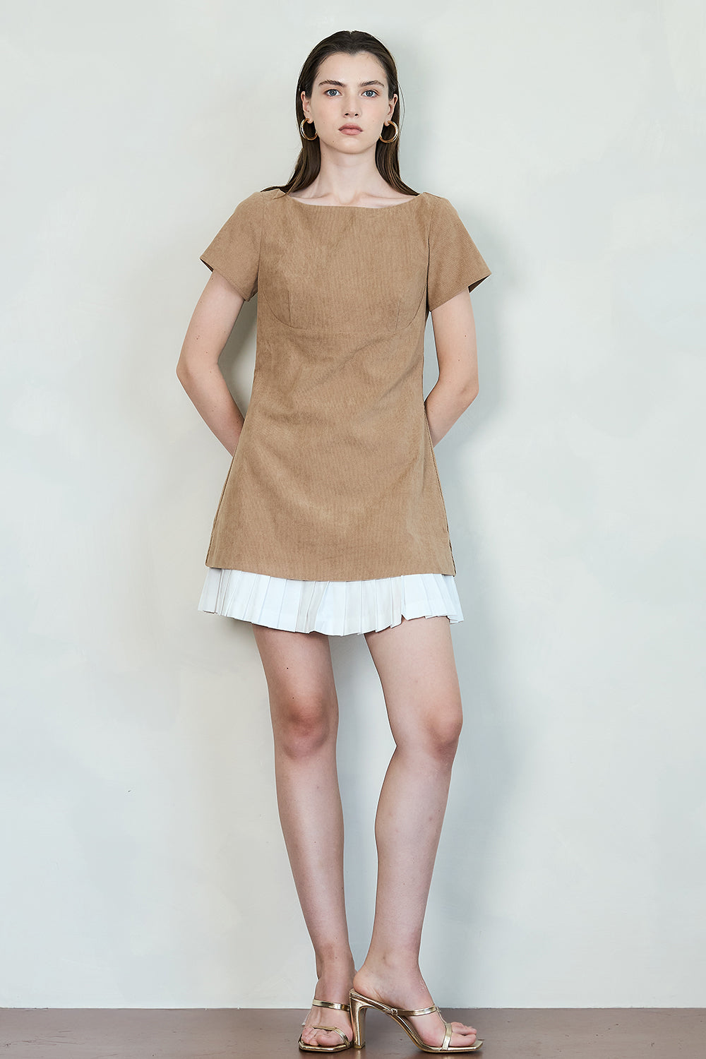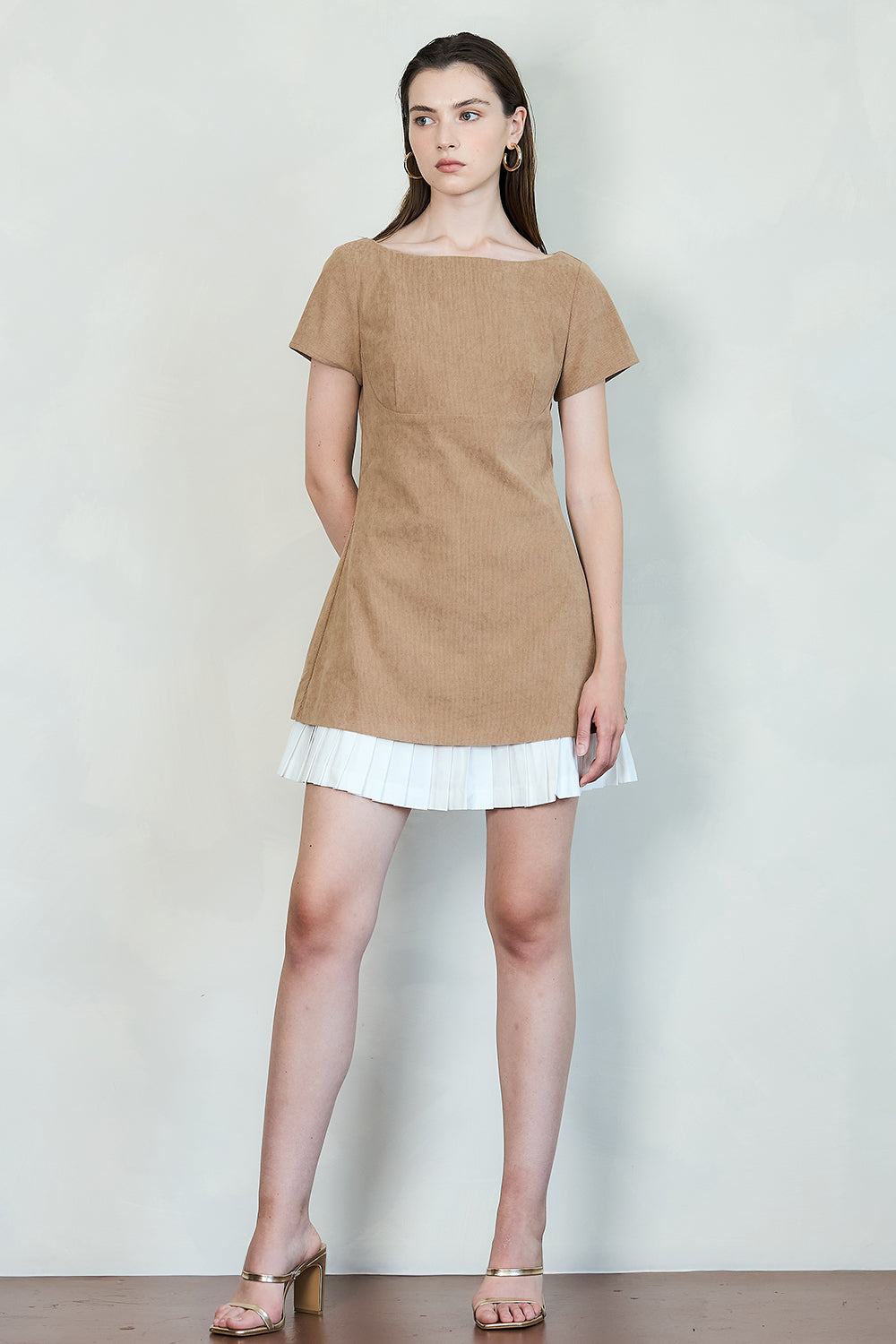 Corduroy Mini Dress with Pleated Ruffle Hem