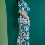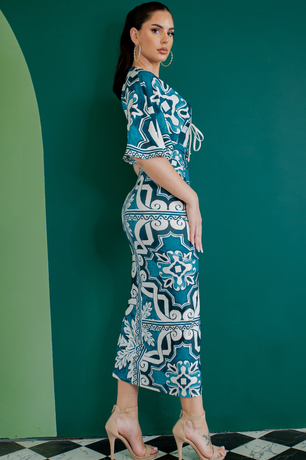 - Deep V neck Midi length dress with front ruched detail
