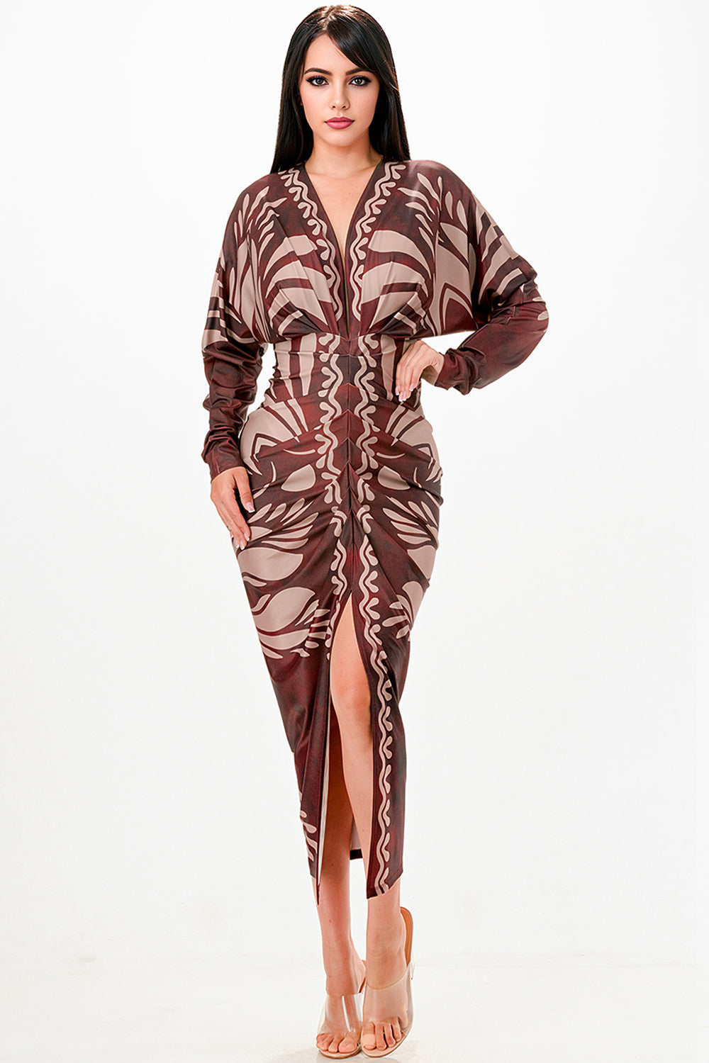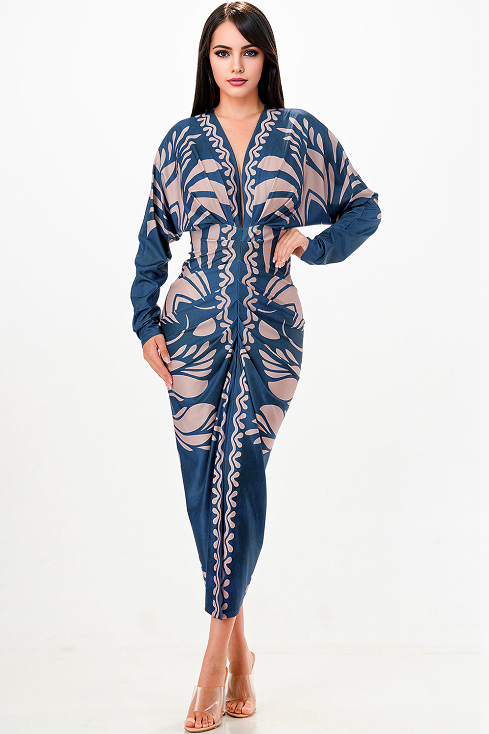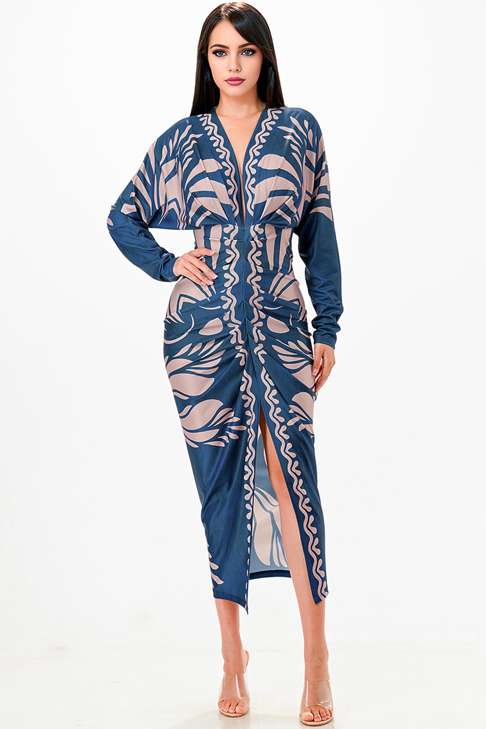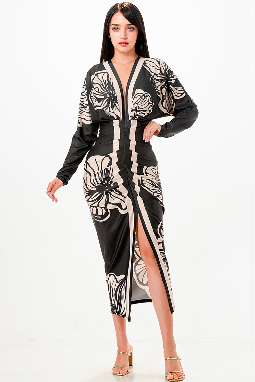 PLUNGE NECK LONG SLEEVE MIDI DRESS