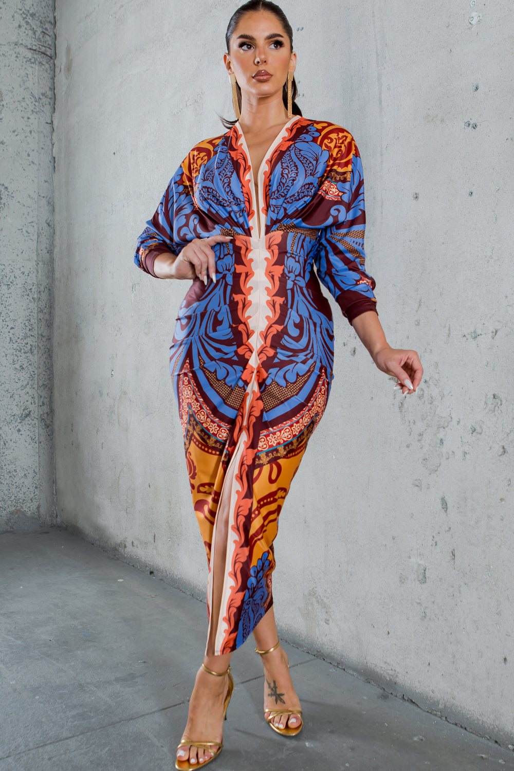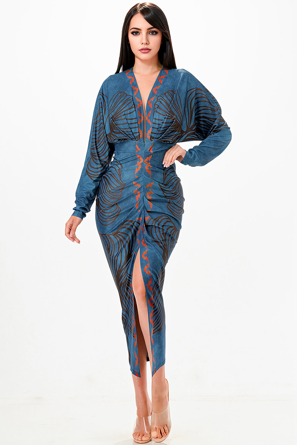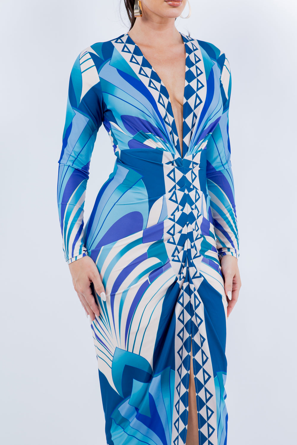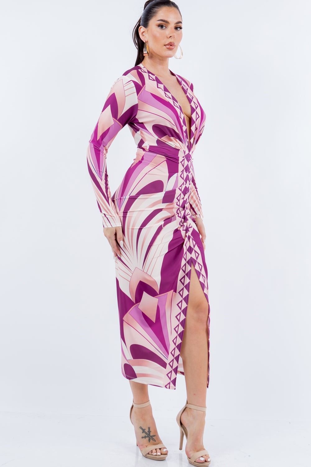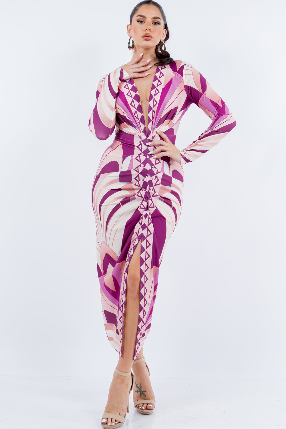 PLUNGE NECK LONG SLEEVE MIDI DRESS
