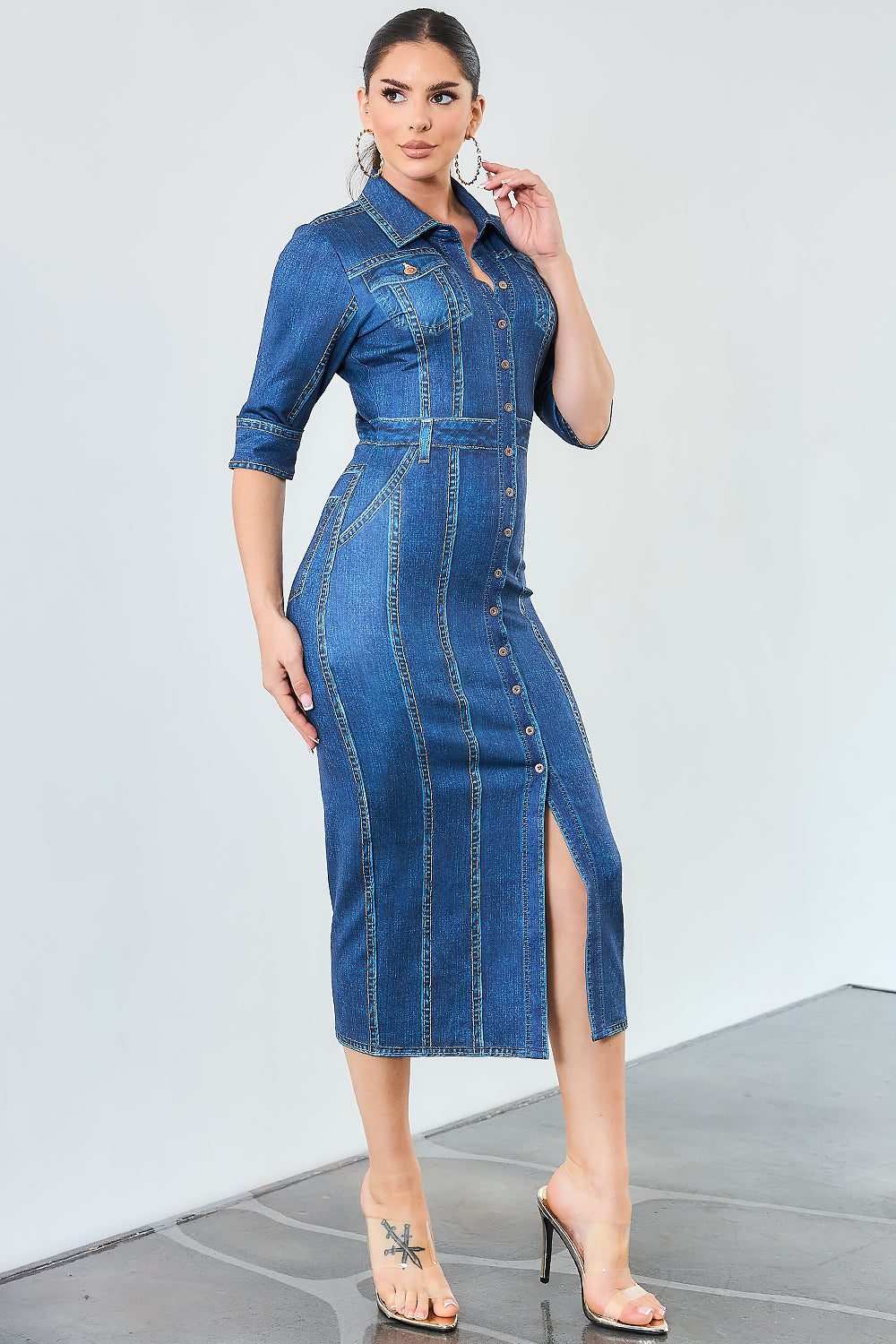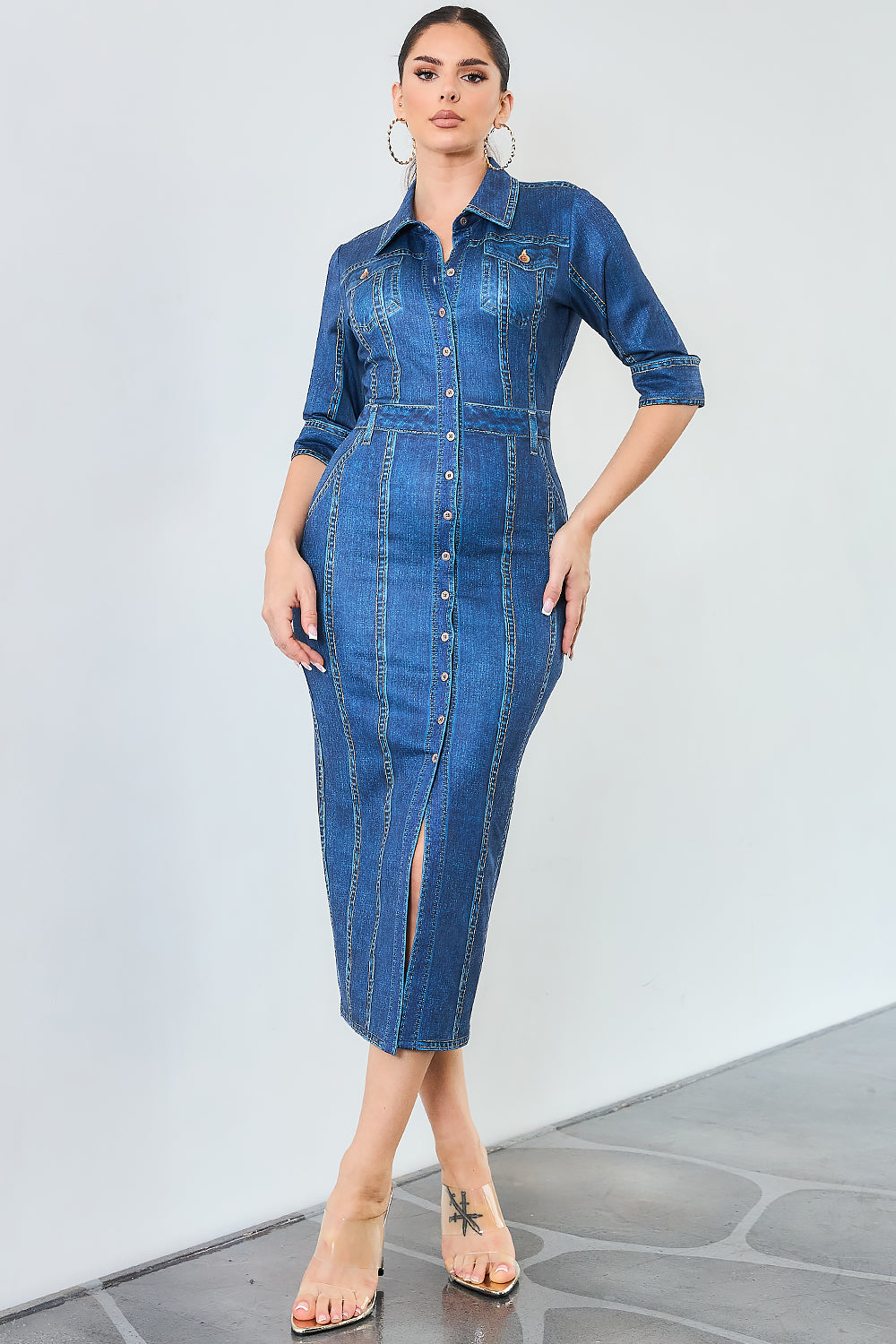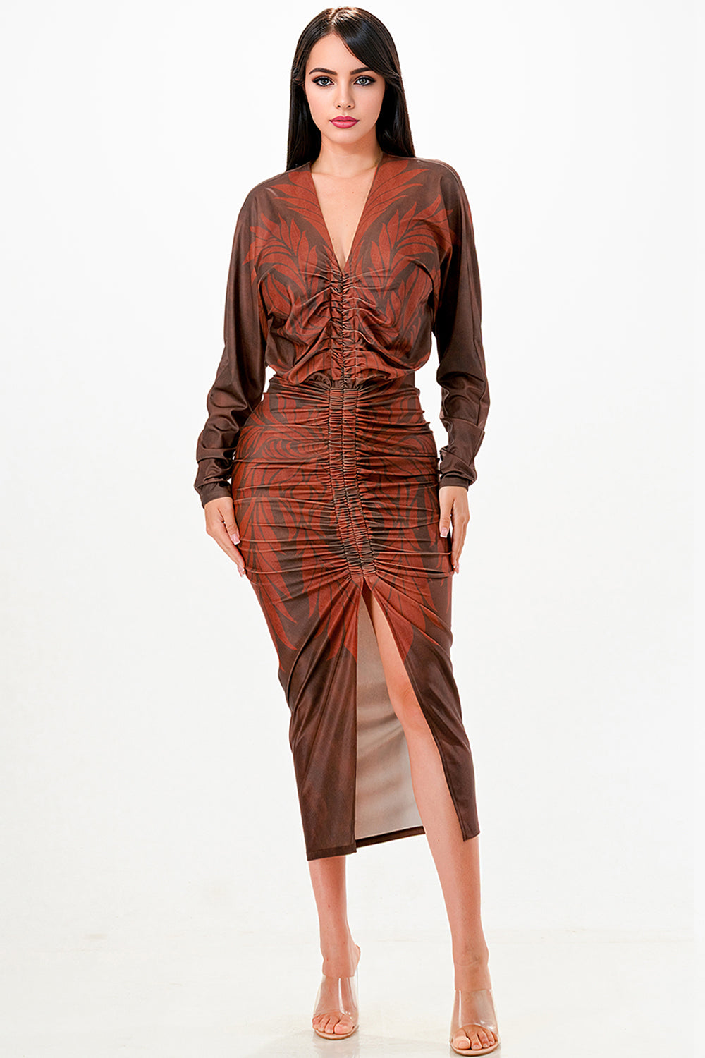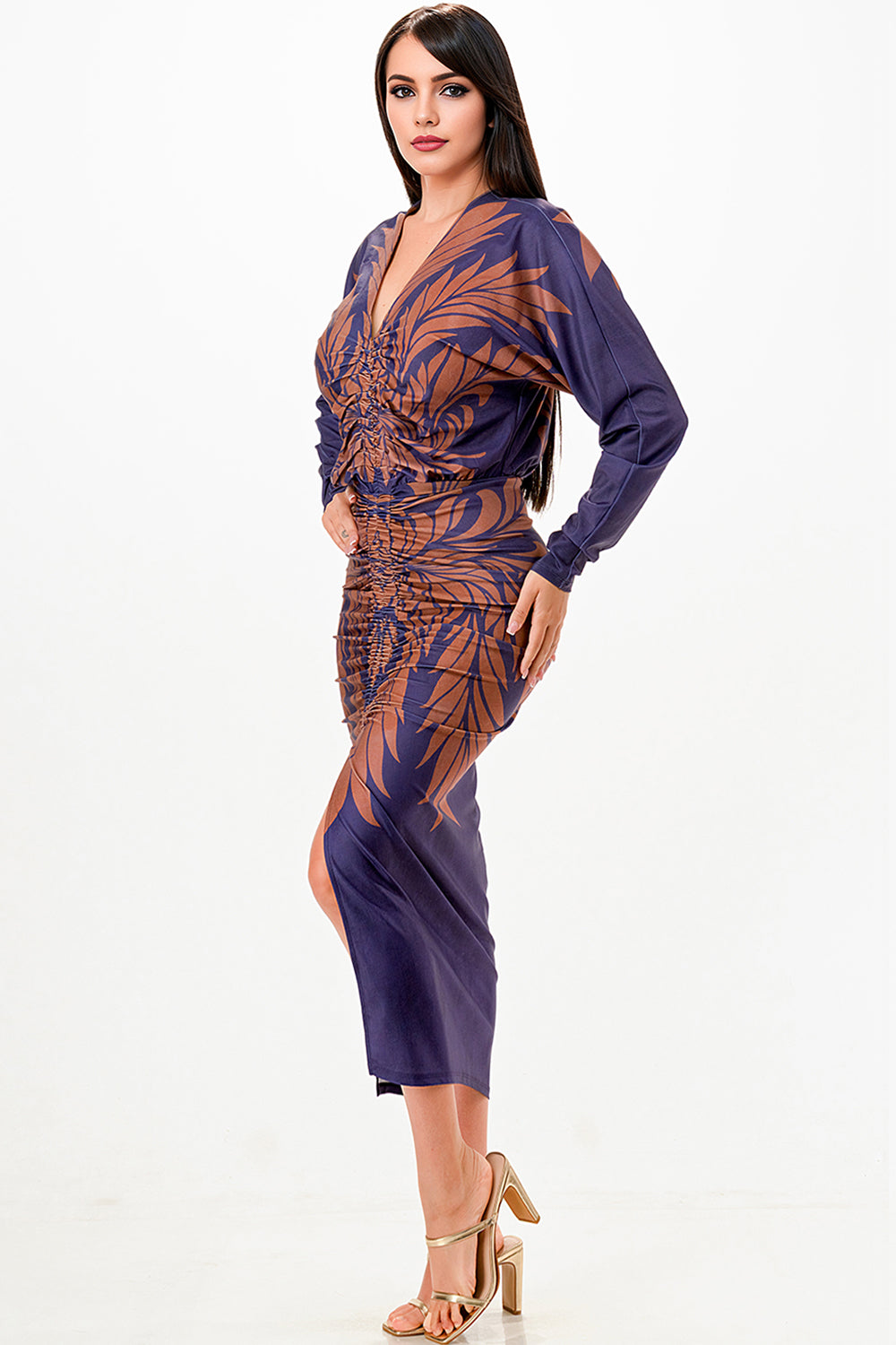 PLUNGE NECK LONG SLEEVE MIDI DRESS