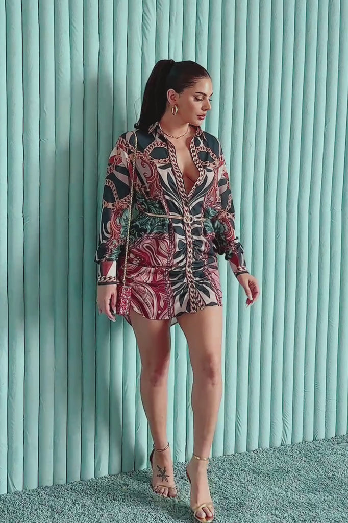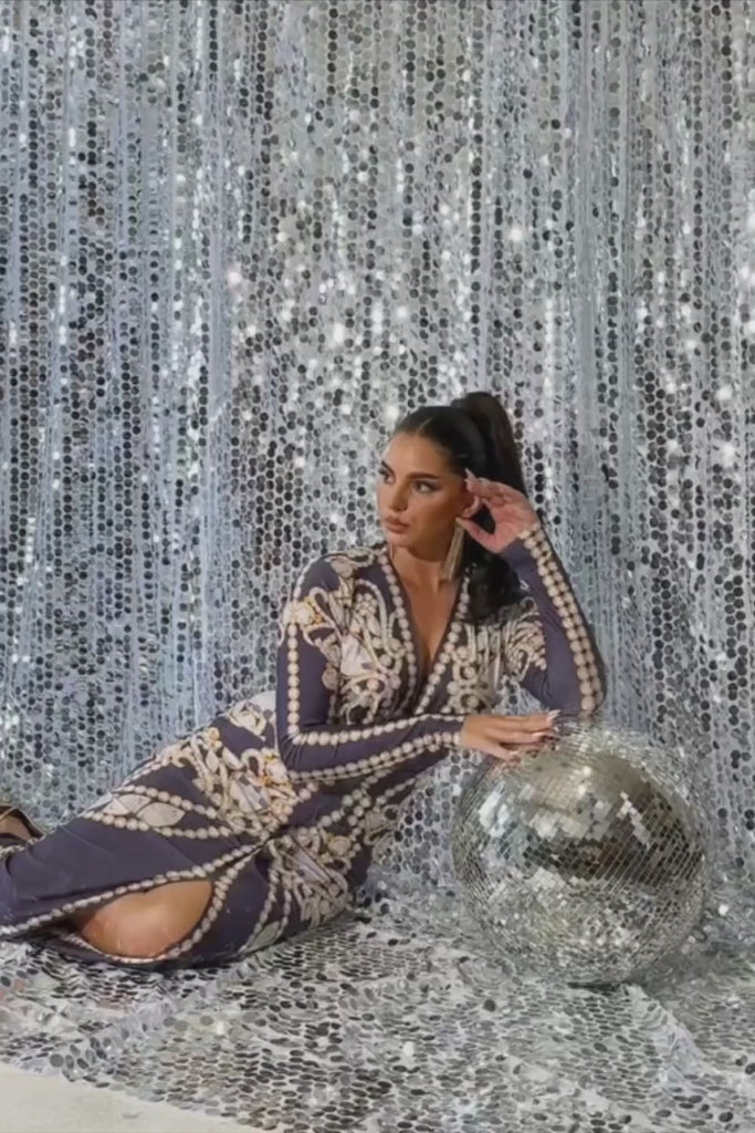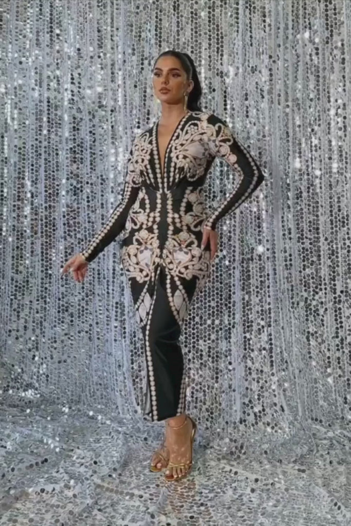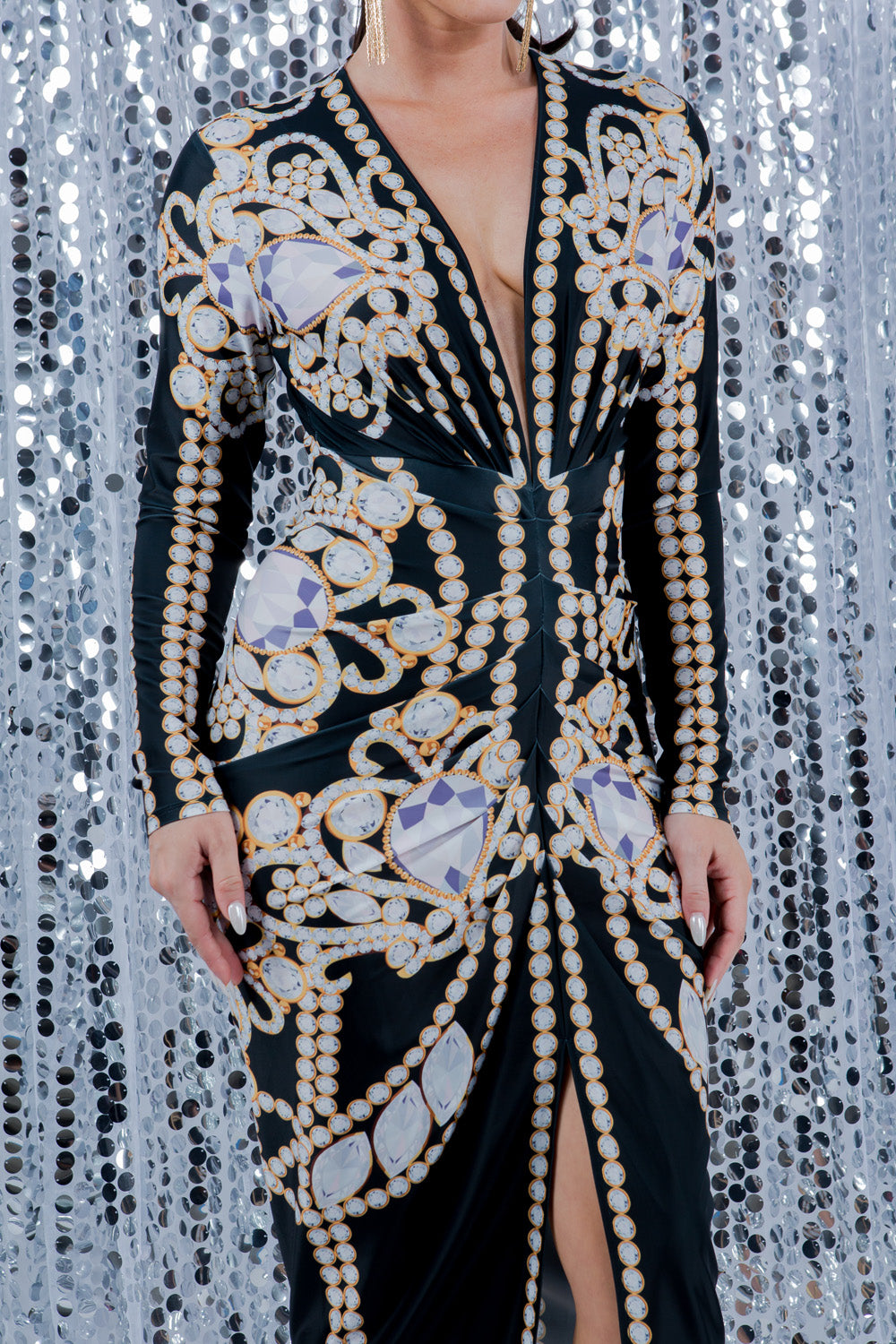 JEWELRY PRINT LONG SLEEVE MIDI DRESS