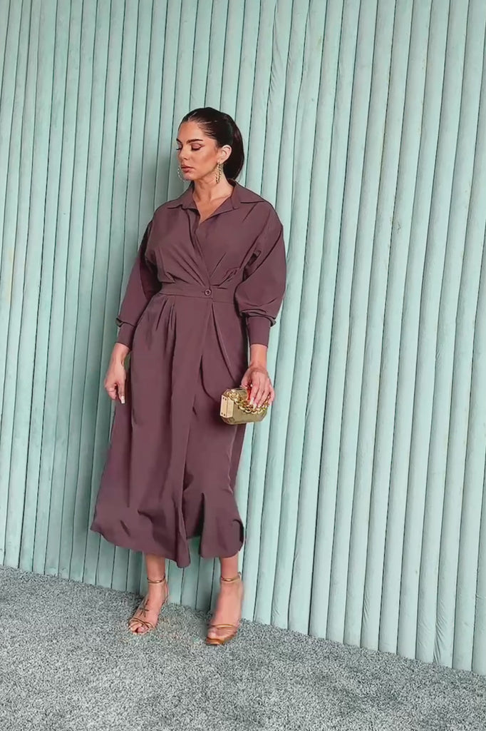 DEEP V NECK LONG SLEEVE MIDI DRESS