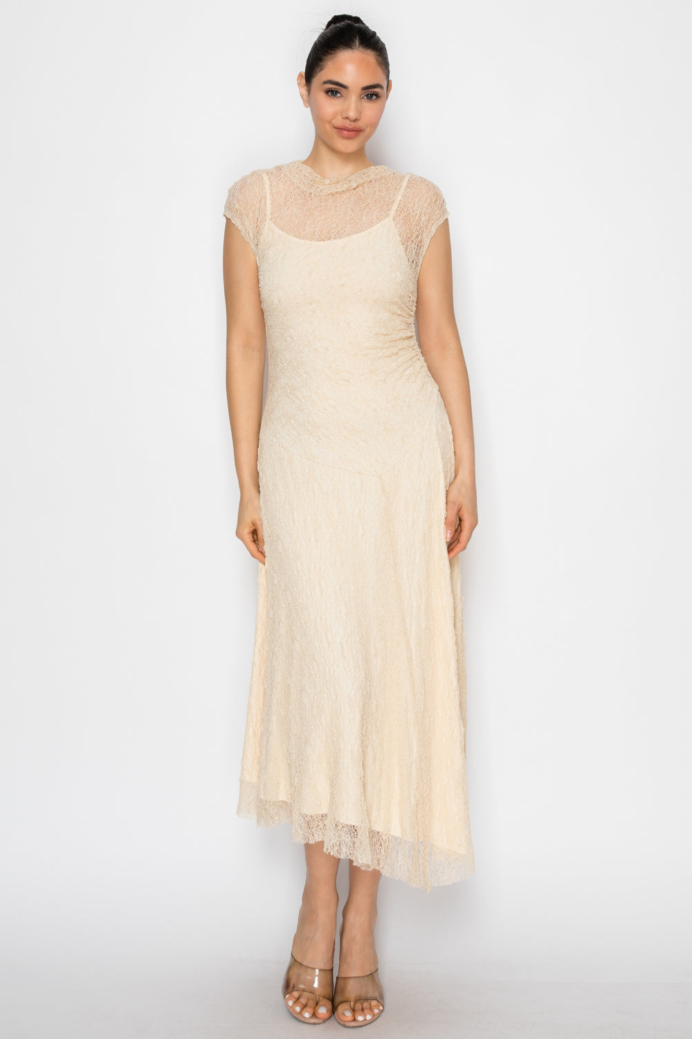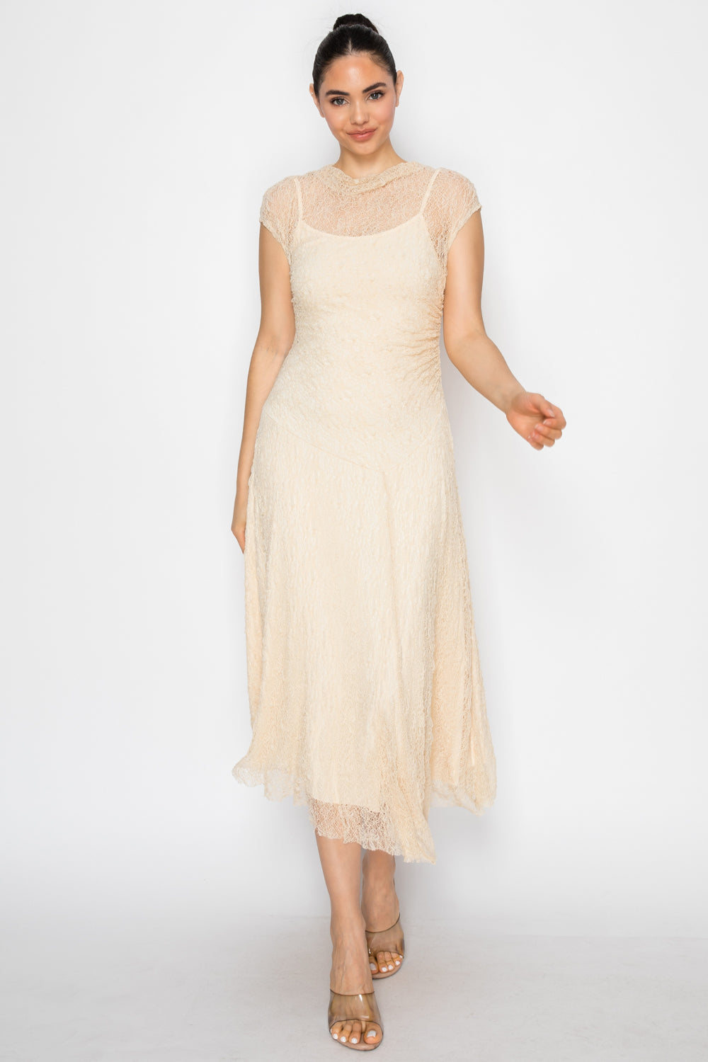 Sheer Lace Cap Sleeve Midi Dress