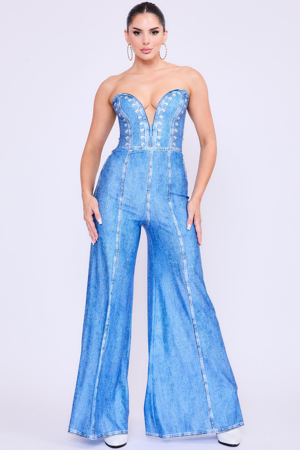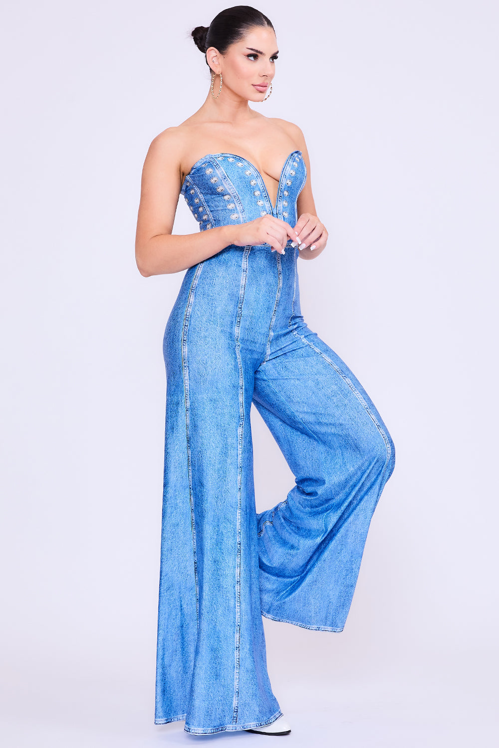 Denim Print Strapless Bustier Style Wide Leg Jumpsuit