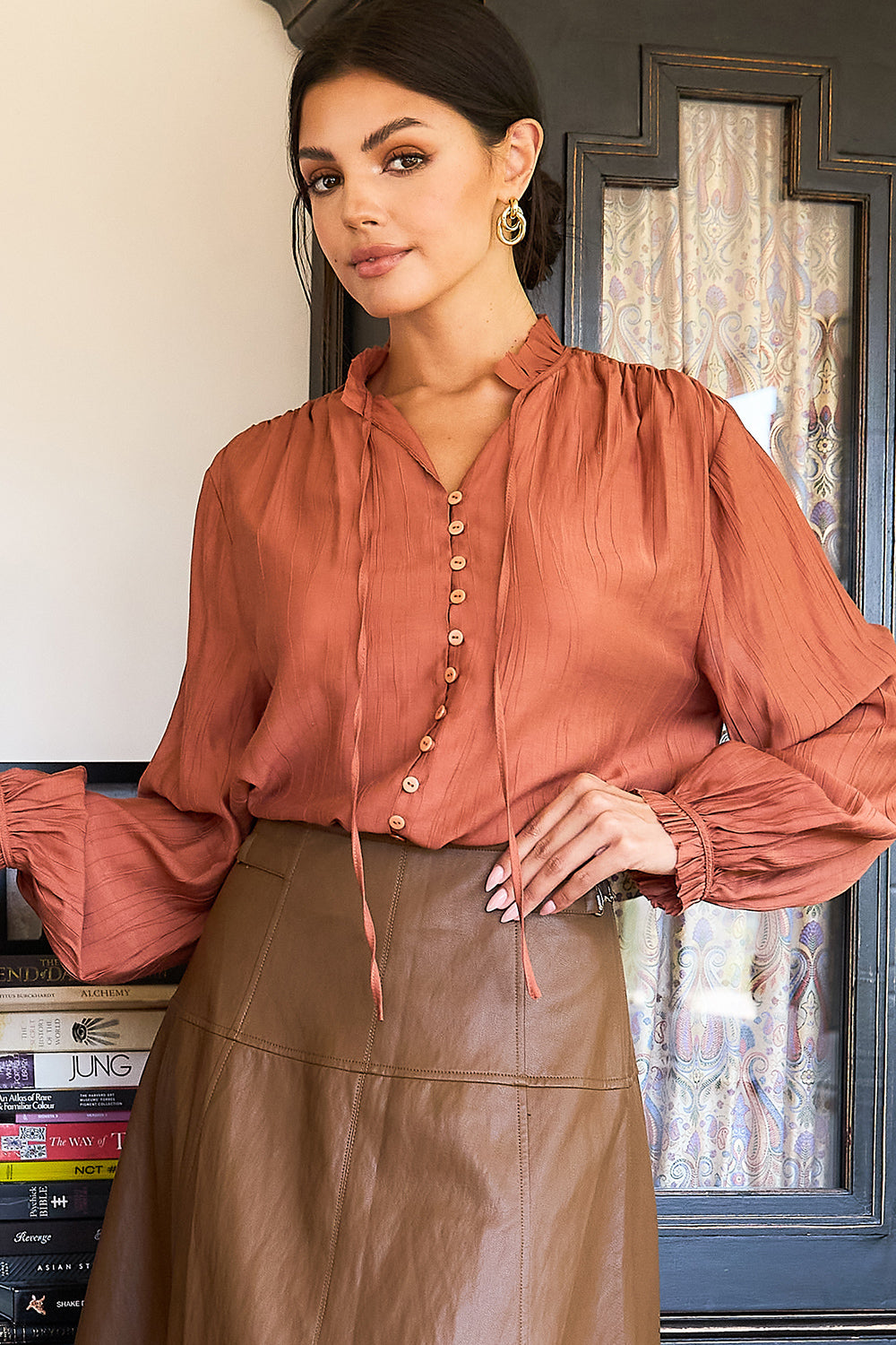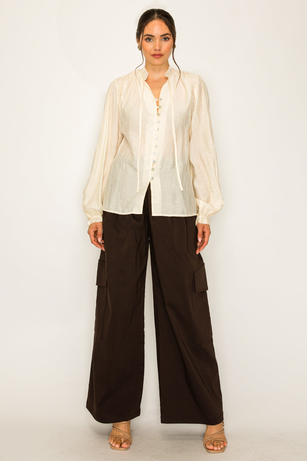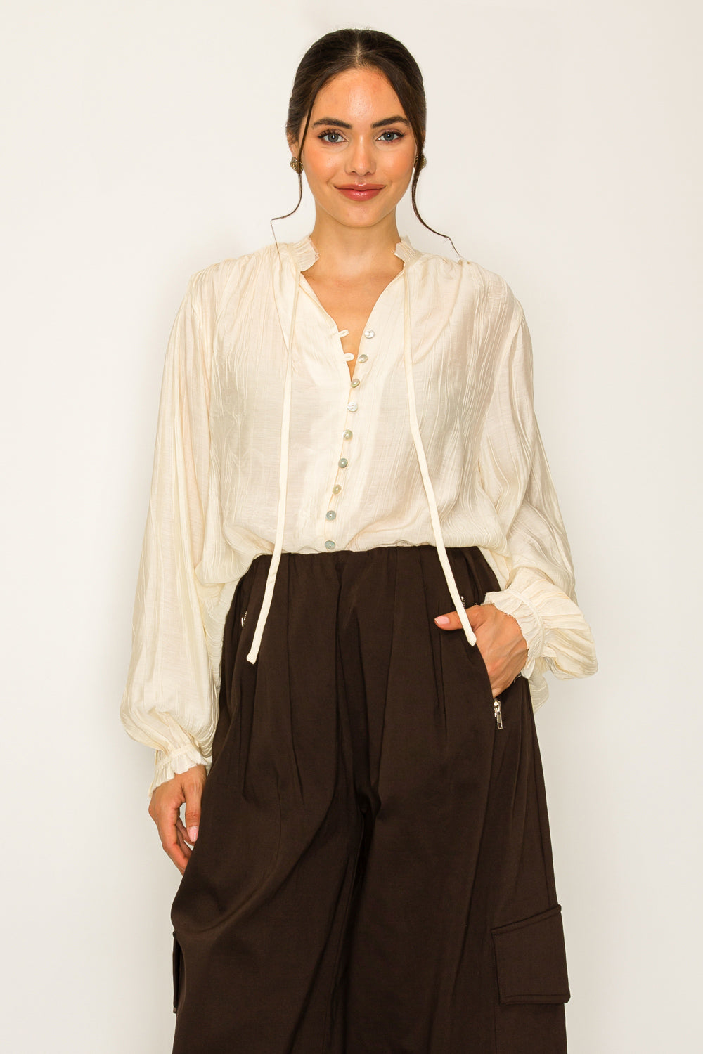 Classic Collared Puff-Sleeve Blouse With Ribbed Waist