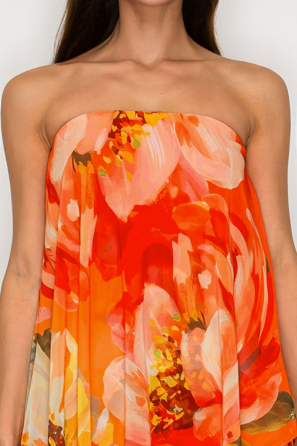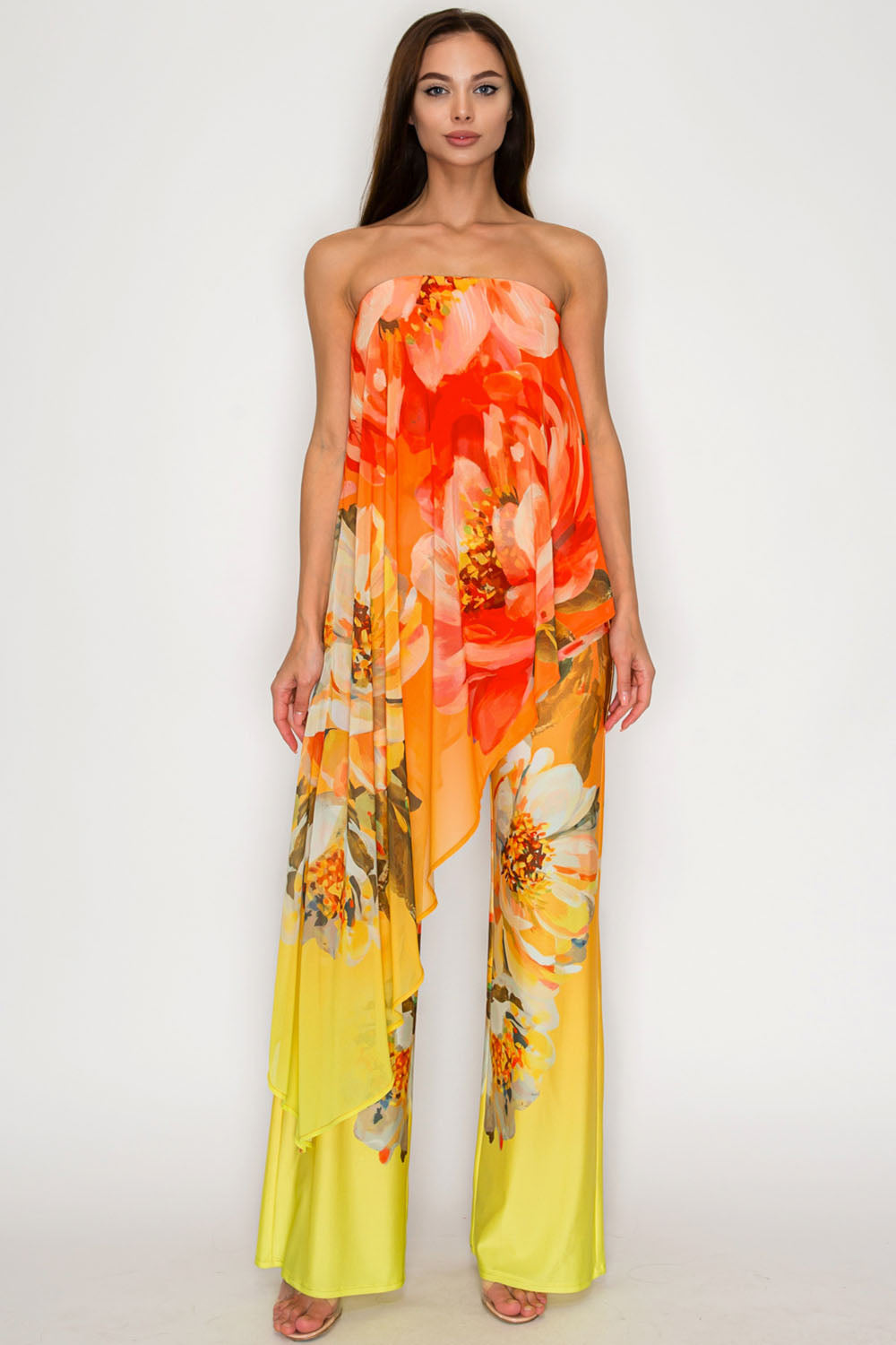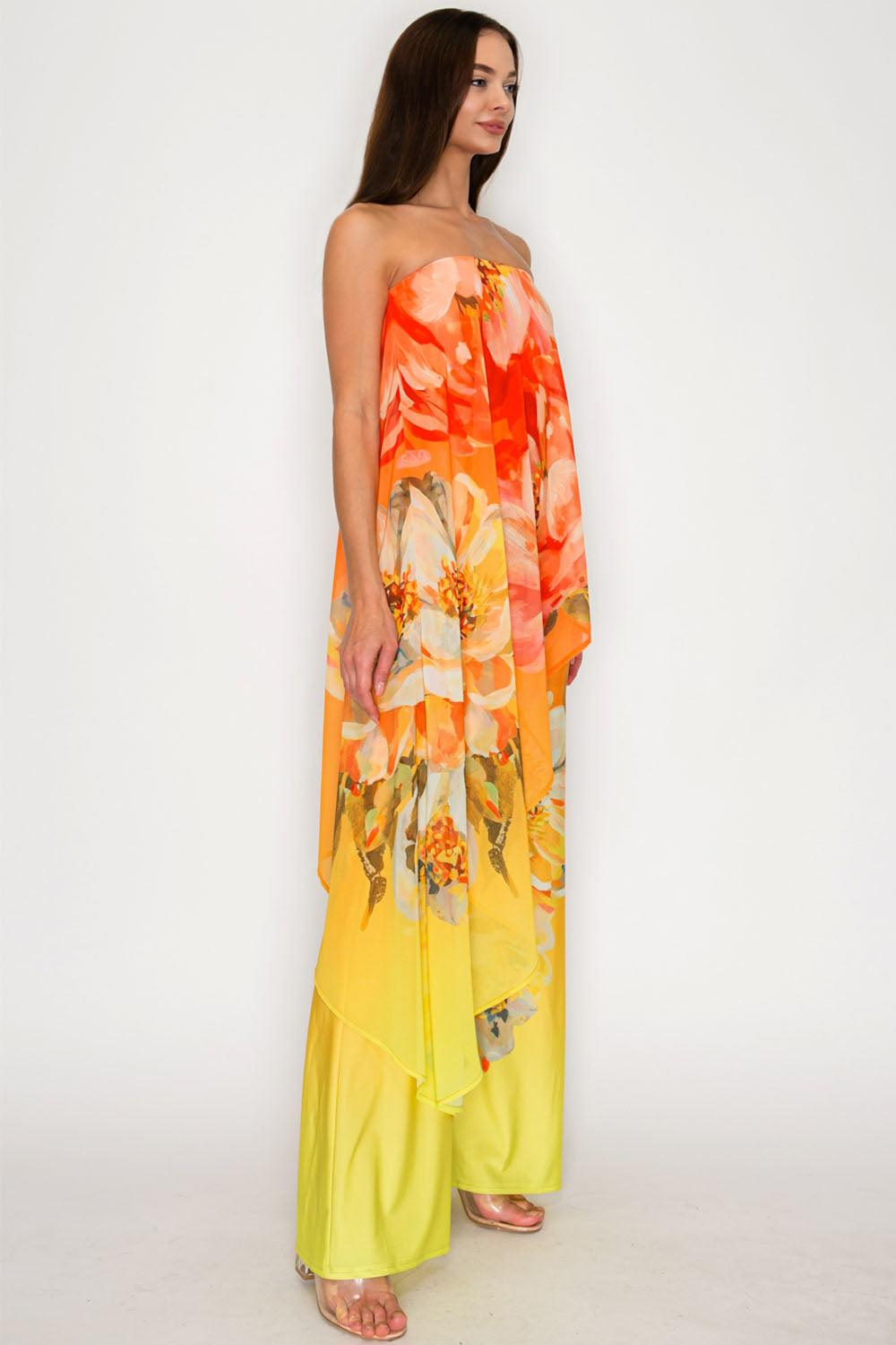 - Strapless tube jumpsuit with draped chiffon overlay
