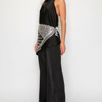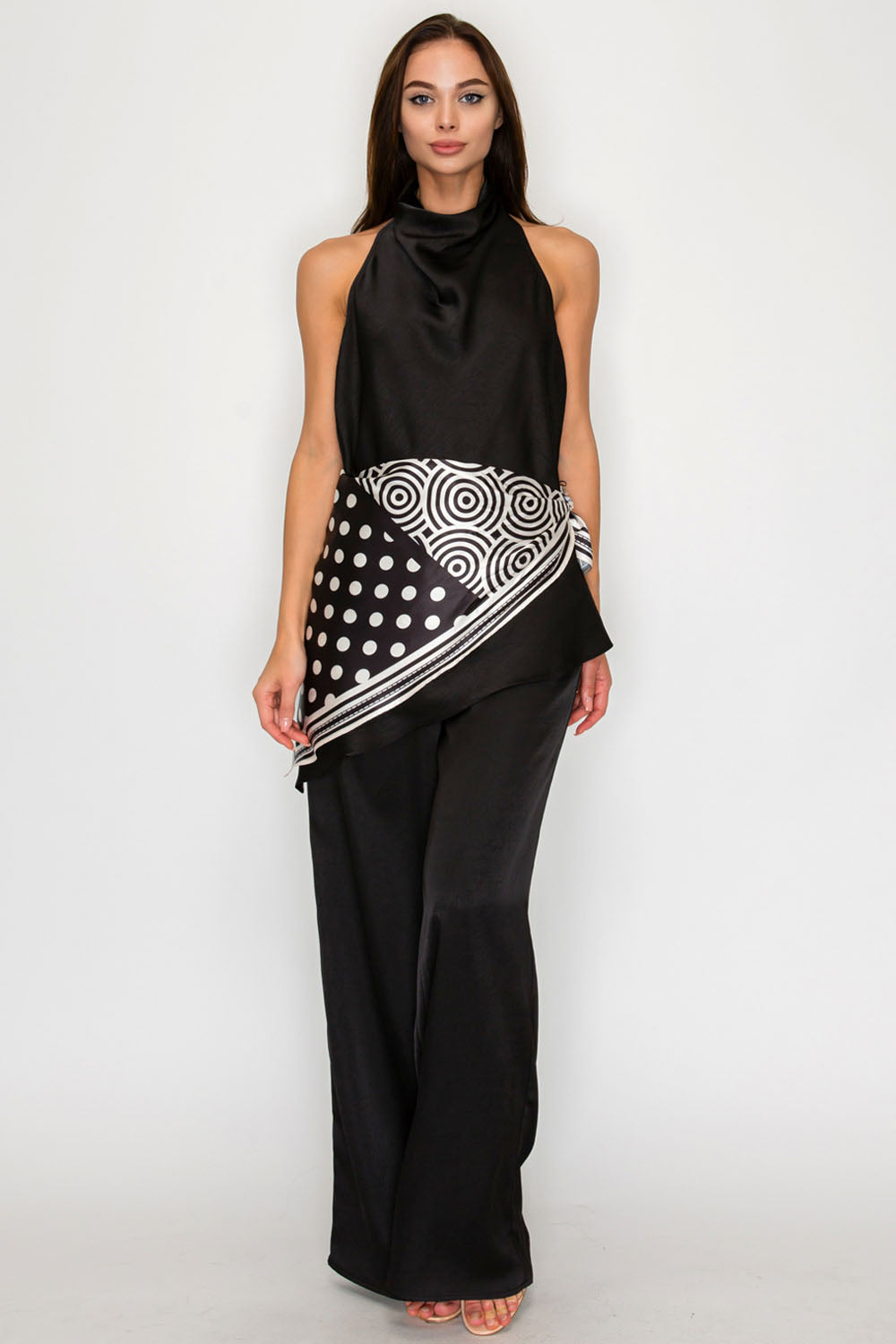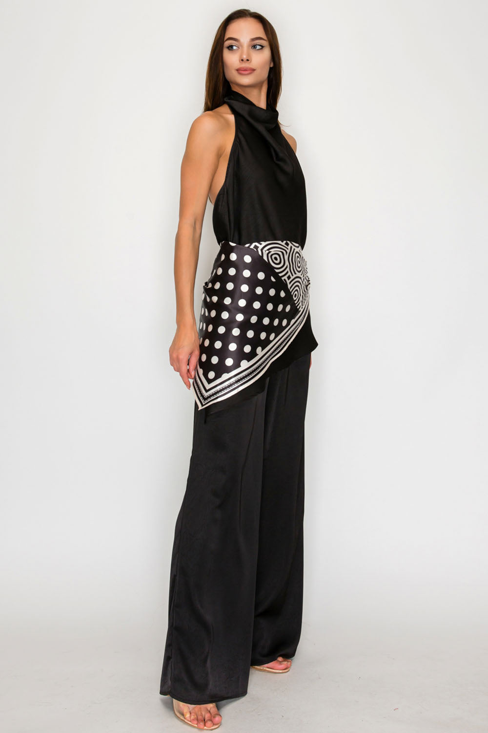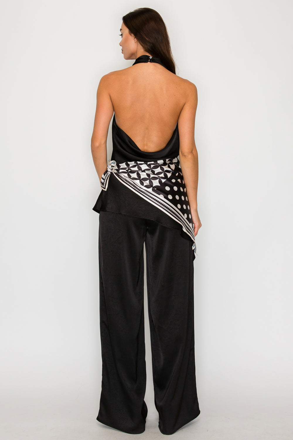 Halter Neck Top & Wide Leg Pants Set with Printed Scarf