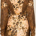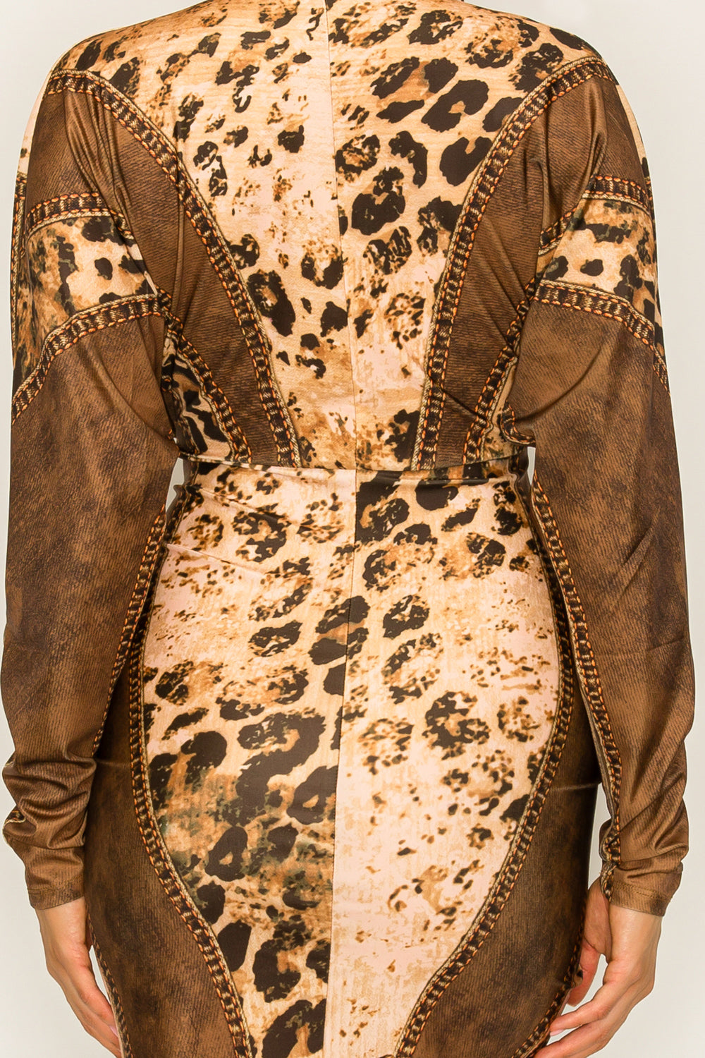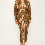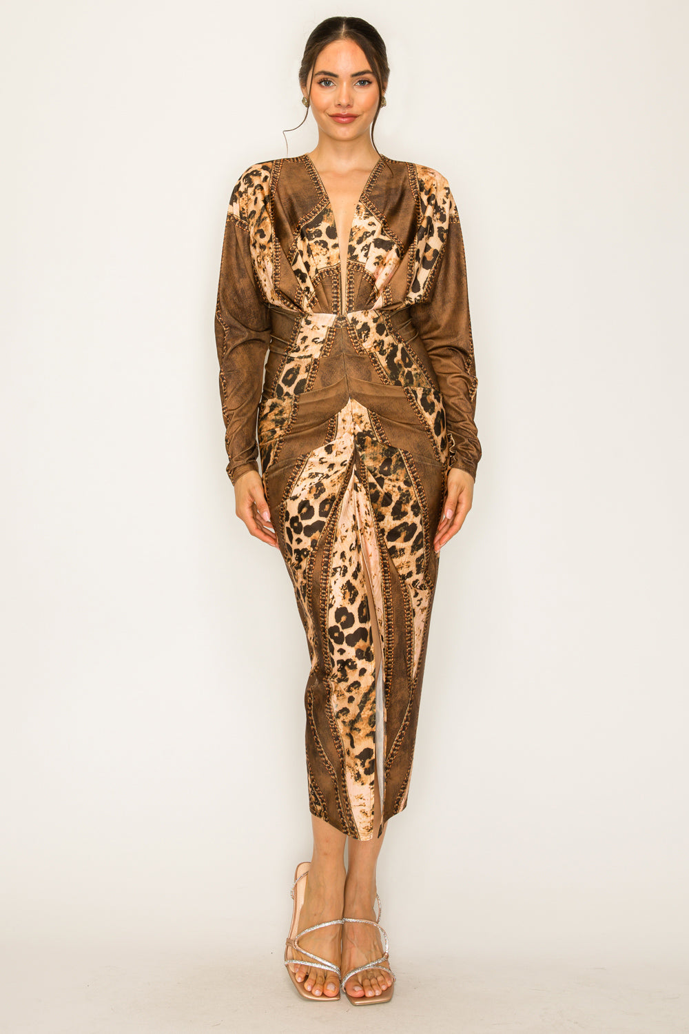Leopard Deep V-neck Long Dolman Sleeve Midi Dress